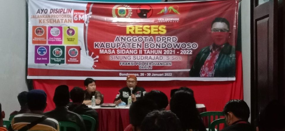Wakil Ketua DPRD Kabupaten Bondowoso dari Partai Demokrasi Indonesia Perjuangan (PDIP), Sinung Sudrajat, melakukan reses masa persidangan ke-II tahun 2021 – 2022 di Kelurahan Nangkaan Kecamatan Kota Bondowoso. Kamis, (17/01/2022) sore.