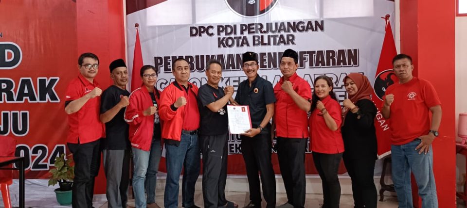 Sugeng Praptono kader PDIP secara resmi mengembalikan formulir pendaftaran sebagai calon kepala daerah (Cakada) Kota Blitar ke kantor DPC PDIP Kota Blitar, Sabtu (11/5/2024).