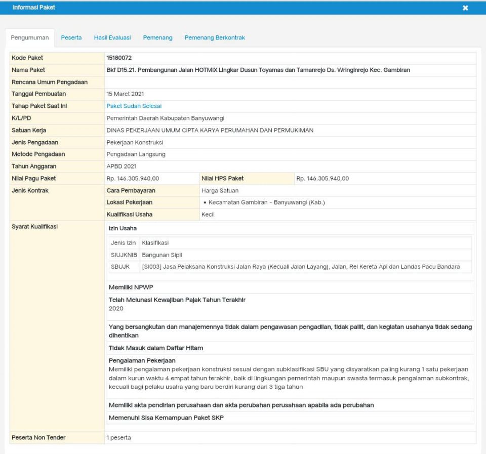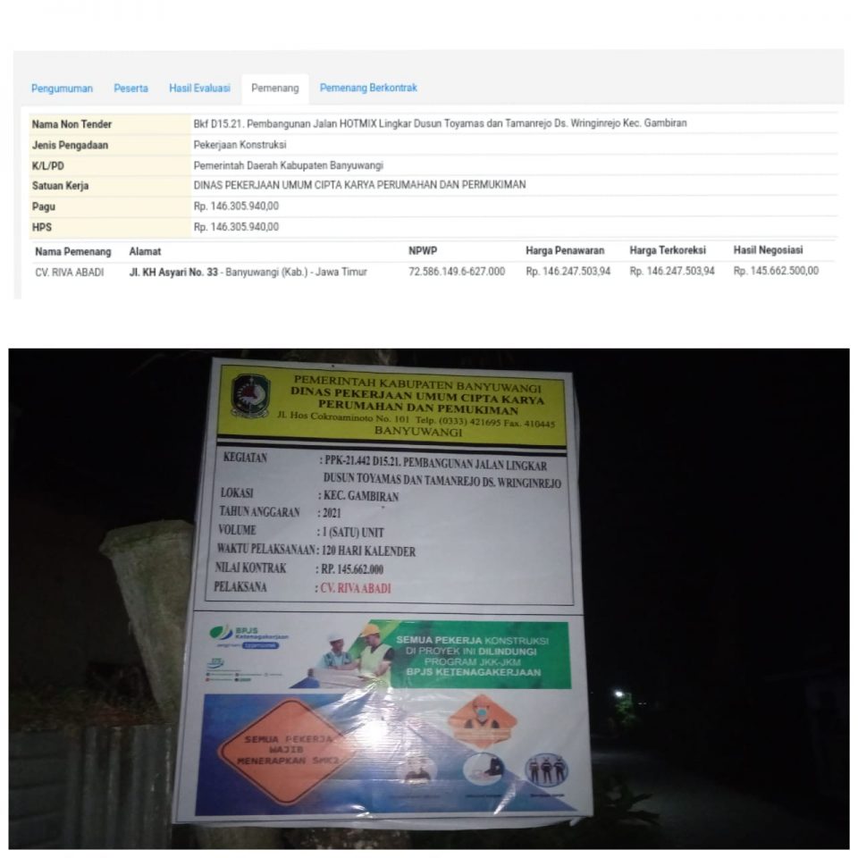 Proyek pembangunan jalan dimana dalam nomenklatur LPSE kode D15.21. Tertulis, “Pembangunan Jalan Hotmix Lingkar Dusun Toyamas dan Tamanrejo Desa Wringinrejo Kecamatan Gambiran”. Namun, fakta di lapangan berupa Paving dengan pemenang CV. Riva Abadi yang beralamat di Jl. Wahid Hasyim Banyuwangi.