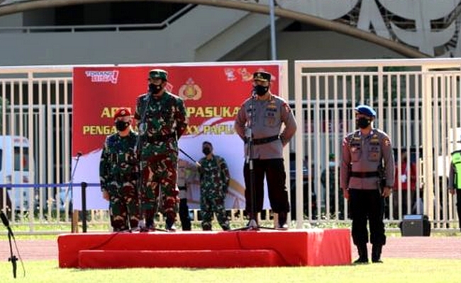 TNI-Polri menjamin keamanan pelaksanaan PON XX Papua. Untuk itu, diperlukan komunikasi, koordinasi dan kolaborasi seluruh aparat keamanan, serta seluruh elemen masyarakat yang ada. Hal tersebut disampaikan Panglima TNI Marsekal TNI Hadi Tjahjantodidampingi Kapolri Jenderal Pol Listyo Sigit Prabowo saat memimpin Apel Gelar Pasukan Pengamanan PON XX Papua di hadapan 2.401 personel yang terdiri dari TNI dan Polri, bertempat di Stadion Lukas Enembe Jayapura, Papua, Rabu (29/9/2021).