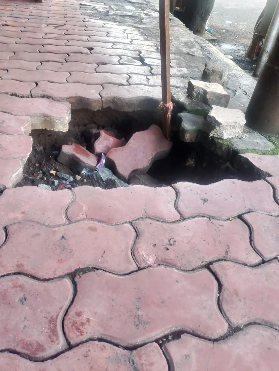 Sebelumnya memang sudah ada lubang sedikit akibat amblesnya paving trotoar. Tapi karena belum ada perbaikan, akhirnya lubangnya semakin lebar.
