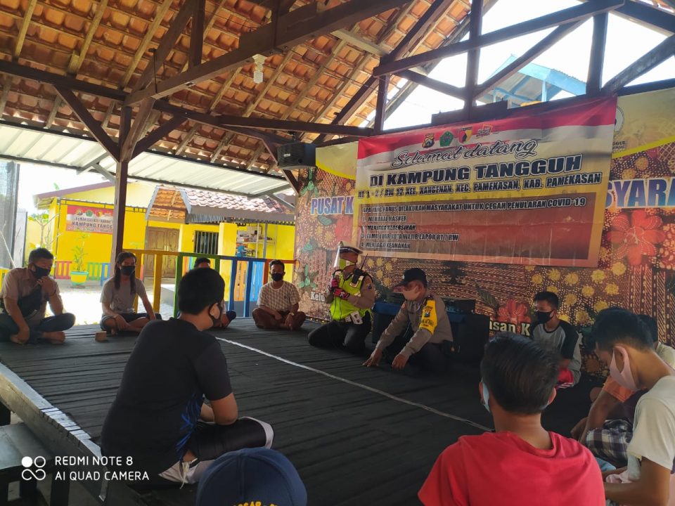 Unit Dikyasa Satlantas Polres Pamekasan melakukan sosialisasi terkait Maklumat Kapolri tentang pencegahan Covid-19 dan program Kampung Tangguh, di Posko Kampung Tangguh Kelurahan Kangenan, Kecamatan kota Pamekasan.