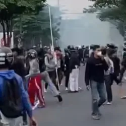 “Ayo maju, semua bergerak, jangan terpisah,” kata salah satu pendemo yang berlari ke arah Gedung Negara Grahadi Surabaya.
