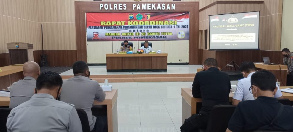 Wakapolres Pamekasan, Kompol Azi Pratas Guspitu, mengatakan, Rakor tersebut dilakukan dalam rangka mempersiapkan proses pengamanan pertandingan perdana kompetisi kasta tertinggi sepakbola tanah air, yang mempertemukan tim tuan rumah Madura United FC melawan PS Barito Putera, di Stadion Gelora Madura Ratu Pamelingan Pamekasan,pada Sabtu (23/7/2022). Lusa.