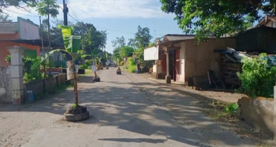 Warga masyarakat Dusun Semanding Desa Banggle Kecamatan Kanigoro memprotes Dinas PU-PR Kabupaten Blitar, dengan melakukan tanam pohon pisang di tengah jalan rusak sudah lebih dari sepekan