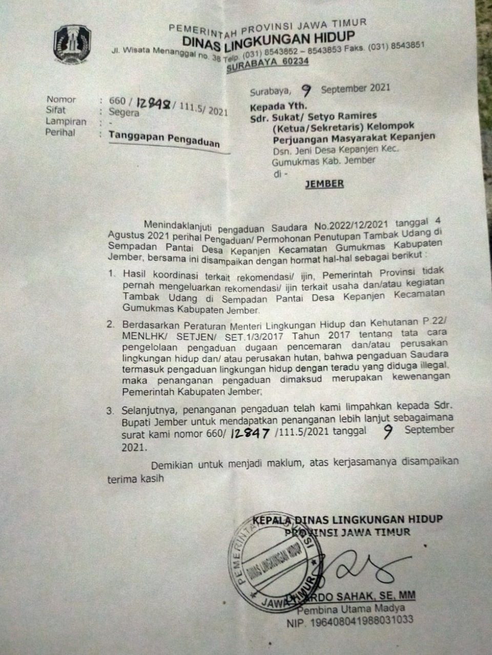 Menurutnya, keberadaan pembangunan tambak yang kini sedang beroperasi di wilayah Kepanjen dianggapnya ilegal.” Kami sudah berkirim surat kepada Dinas lingkungan hidup provinsi terkait keberadaan tambak udang disepadan pantai tersebut. Dan hasilnya pihak Dinas lingkungan hidup provinsi menyatakan tidak pernah mengeluarkan ijin pembangunan tambak tersebut,”ujarnya .