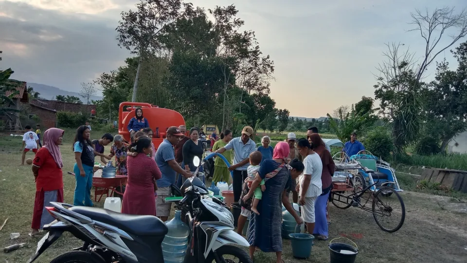 Akibatnya warga mengalami krisis air bersih dan harus rela antre saat bantuan air bersih datang dari pemerintah.