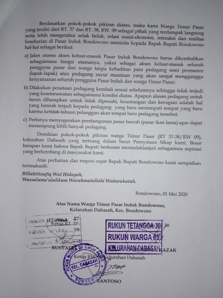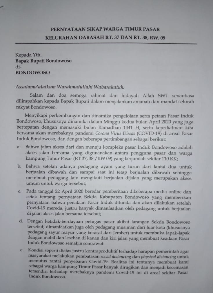 Sebanyak 63 warga tumur Pasar Induk, RT, 37 dan 38, RW 09 Kelurahan Dabasah Kecamatan Kota Bodowoso, melayangkan surat protes terhadap Bupati terkait membludaknya pedagang sayur dan ikan dari lantai dua turun ke bawah. Sehingga aturan pemerintah terkait jaga jarak tidak lagi di indahkan.